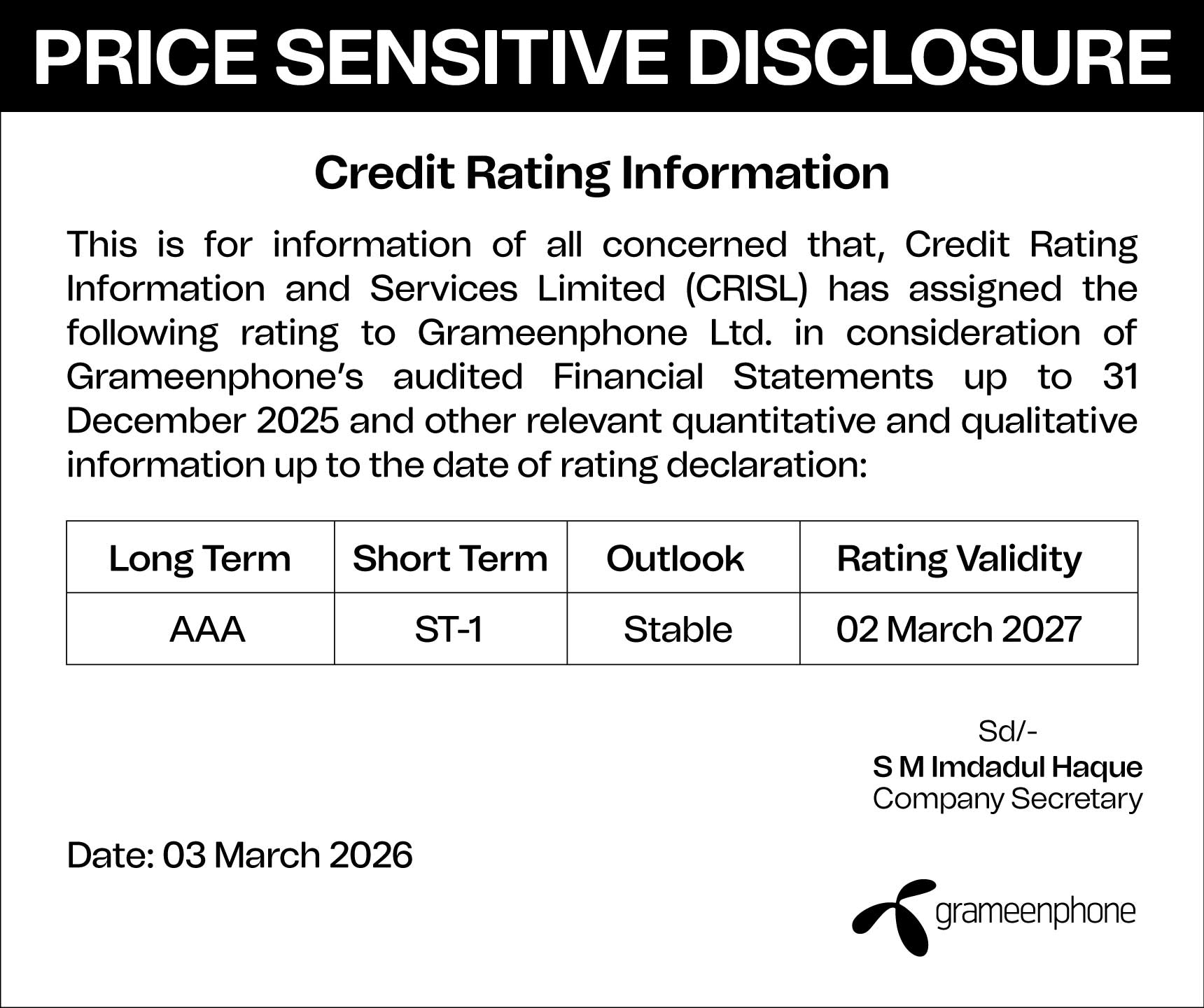 | 1 | Credit Rating Information (03.03.2026) |